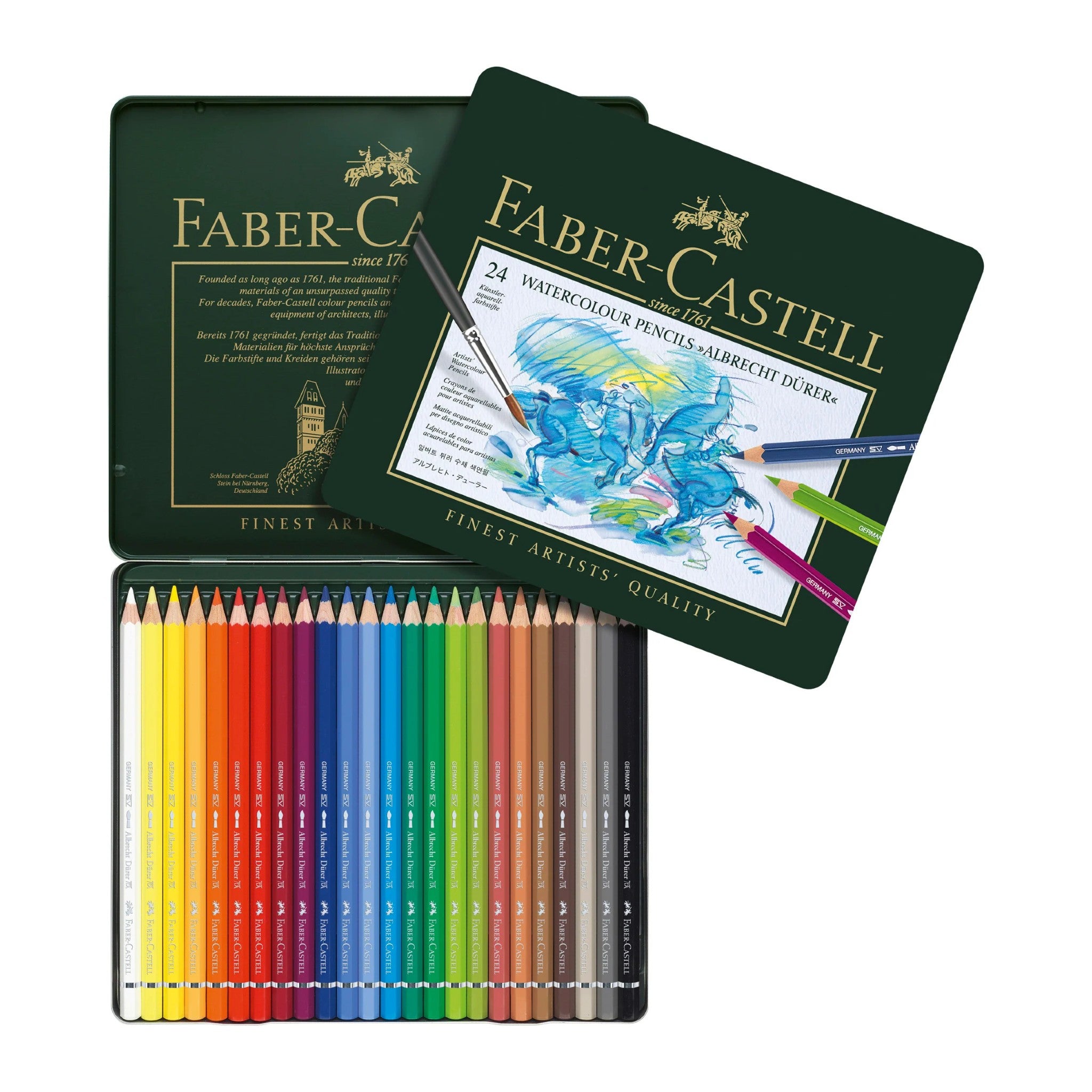 From Faber-Castell: Albrecht Dürer Artists' Watercolor Pencils are available in 120 colors that are part of a unique color matching system - encompassing all Faber-Castell Art & Graphic products. They contain the highest quality pigments of unsurpassed lightfastness and brilliance, which is rated on each pencil. Thick 3.8mm break-resistant and fully water-soluble leads, can be easily blended when wet and become permanent when dry for rich watercolor effects. This tin features 24 individual pencils.