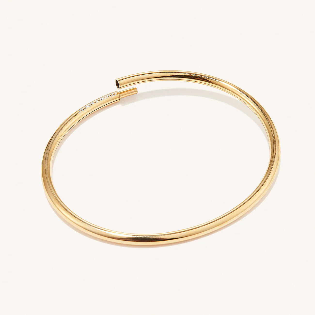 Dane is super easy to put on and remove. To open, gently pull apart the bangle at the seam, rotating the tubes in opposite directions. Close by rotating back to the seam, and inserting the smaller tube into the opening. The perfect piece to wear if you don’t intend to take it off.