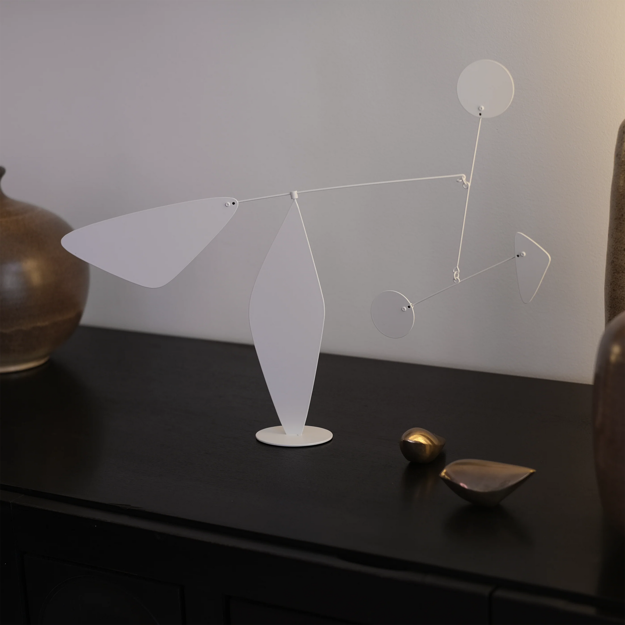 From VOLTA: This metallic sculpture, with its timeless and refined style, evokes a subtle harmony between rigor and fluidity. Its delicately crafted blades, made of high-quality aluminum, float like leaves carried by the wind, supported by fine, hand-bent steel stems. Anchored by a solid base, it combines lightness and stability, infusing your space with a touch of serenity. Enclosed in an elegant blue box, embossed with gold leaf, it is more than just an object: it is a unique piece to be gifted to yourself or to those you hold dear. Each mobile is unique, so dimensions may slightly vary.