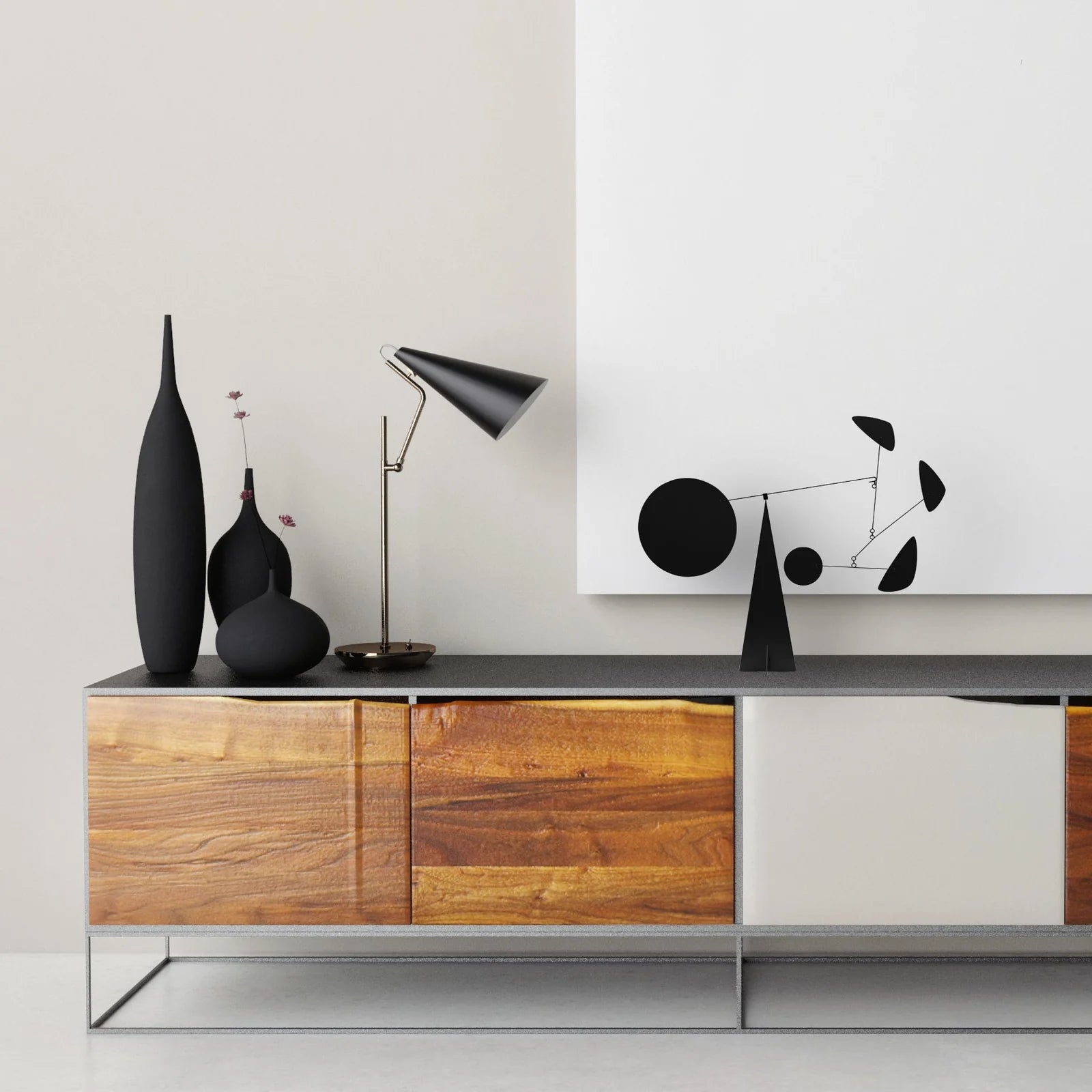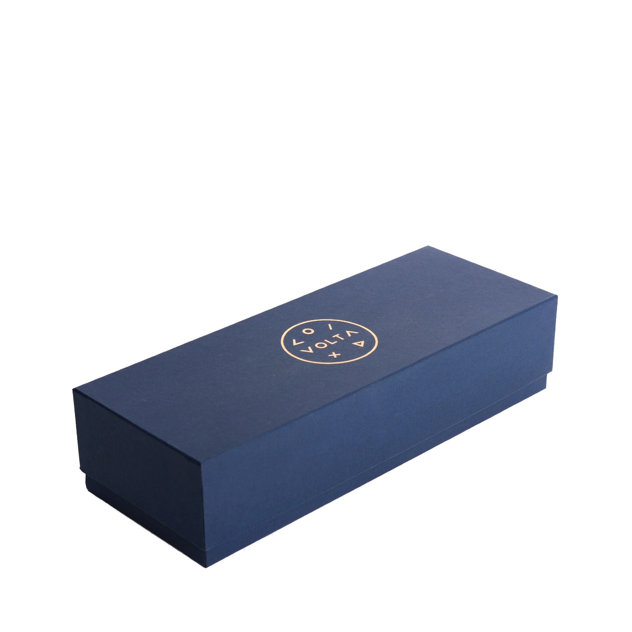 From VOLTA: This metallic sculpture, with its timeless and refined style, evokes a subtle harmony between rigor and fluidity. Its delicately crafted blades, made of high-quality aluminum, float like leaves carried by the wind, supported by fine, hand-bent steel stems. Anchored by a solid base, it combines lightness and stability, infusing your space with a touch of serenity. Enclosed in an elegant blue box, embossed with gold leaf, it is more than just an object: it is a unique piece to be gifted to yourself or to those you hold dear. Each mobile is unique, so dimensions may slightly vary.