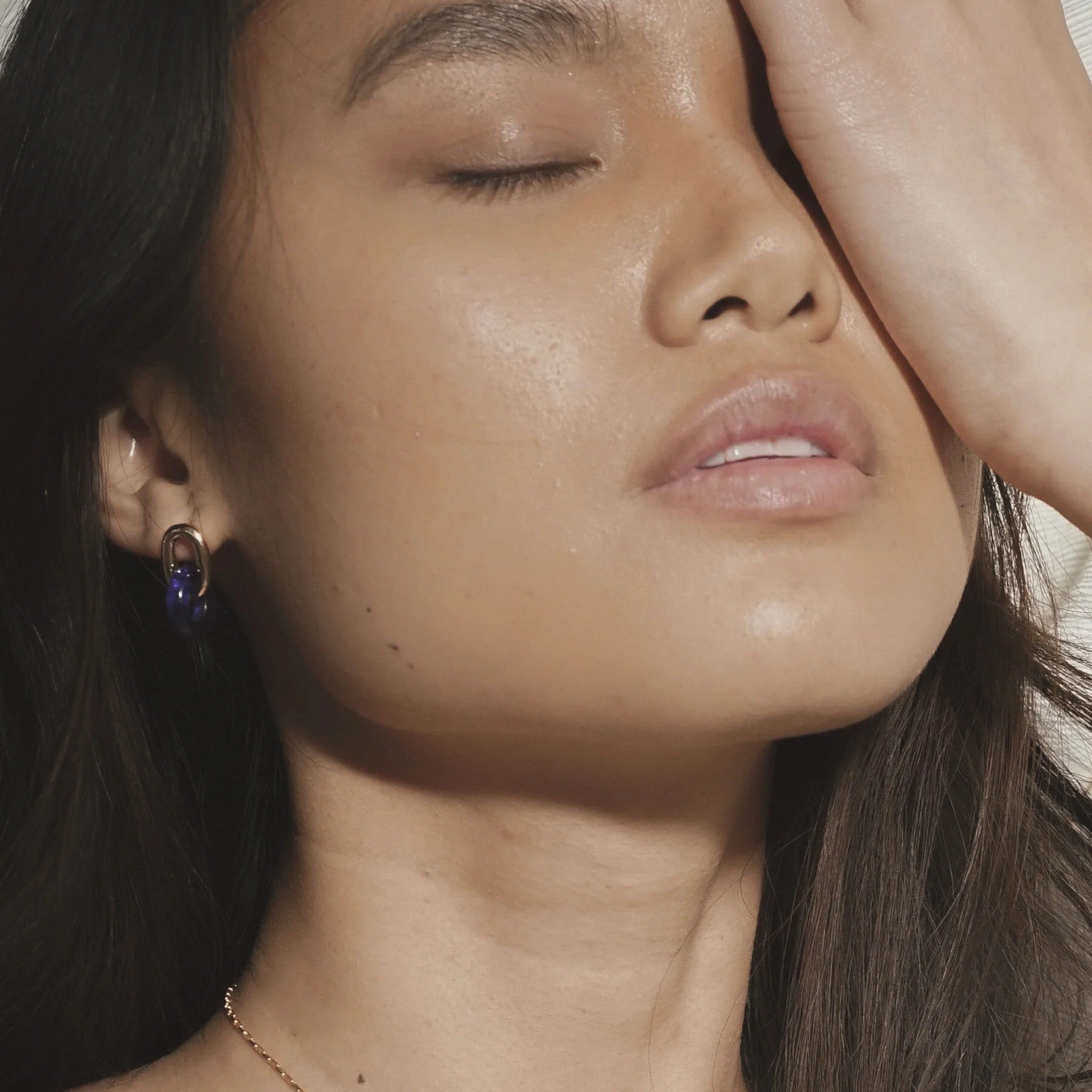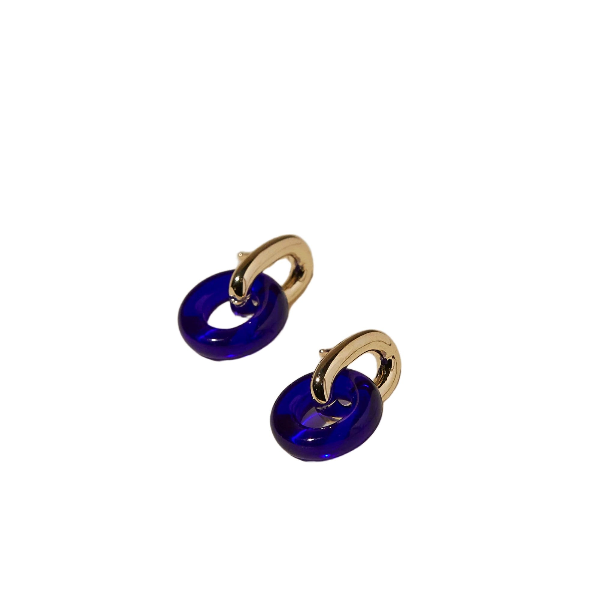 From Lindsay Lewis: An easy to wear, minimal yet interesting staple with a pop of color! Two hand cast and polished ovals linked with cobalt blue glass rings.