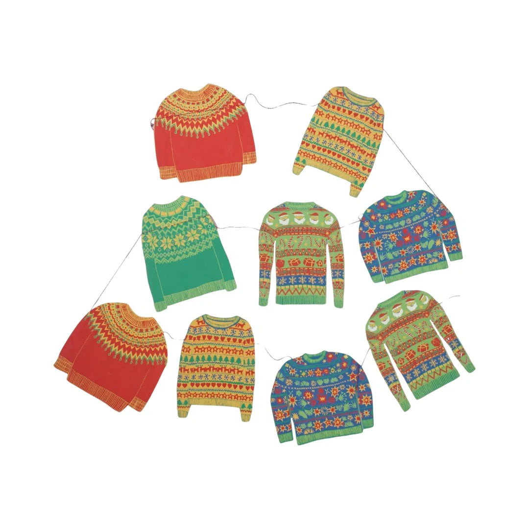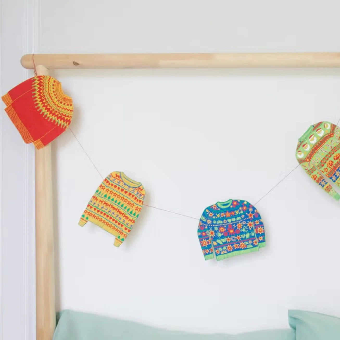 From East End Press: Ten fun Christmas sweaters are strung along this three metre garland, with a range of festive designs and patterns adorning each jumper. Screen printed by hand on both sides by talented artisans in Jaipur.