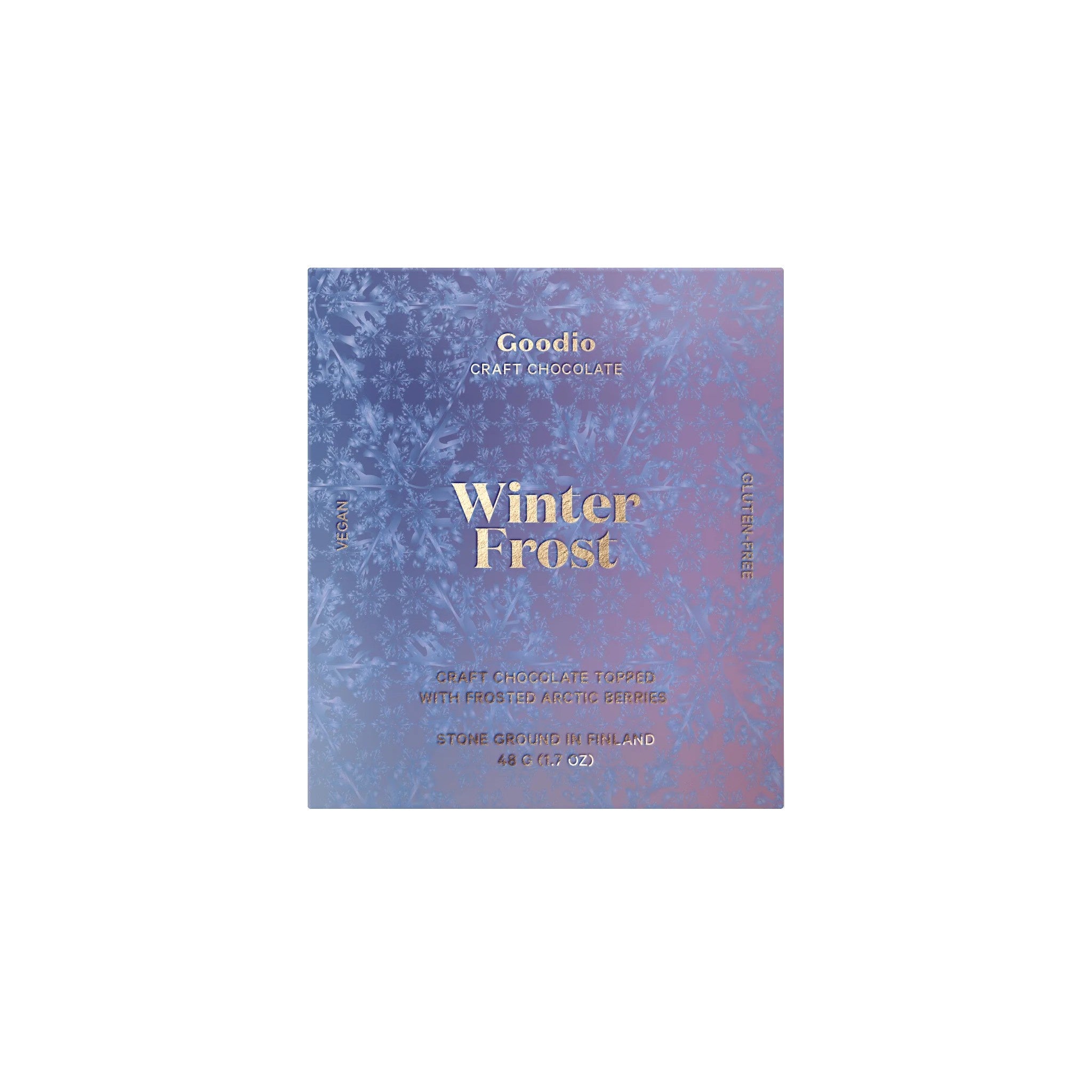 From Goodio: Dark chocolate topped with frosted Nordic berries. When everything is covered in frost and ice, it's time to indulge yourself with the chocolate from the North. This bar is proudly handmade with love in Finland - the happiest country in the world by Goodio Chocolate Artists. Shelf life: 24–36 months. Storage: Shelf-stable. Enjoy!