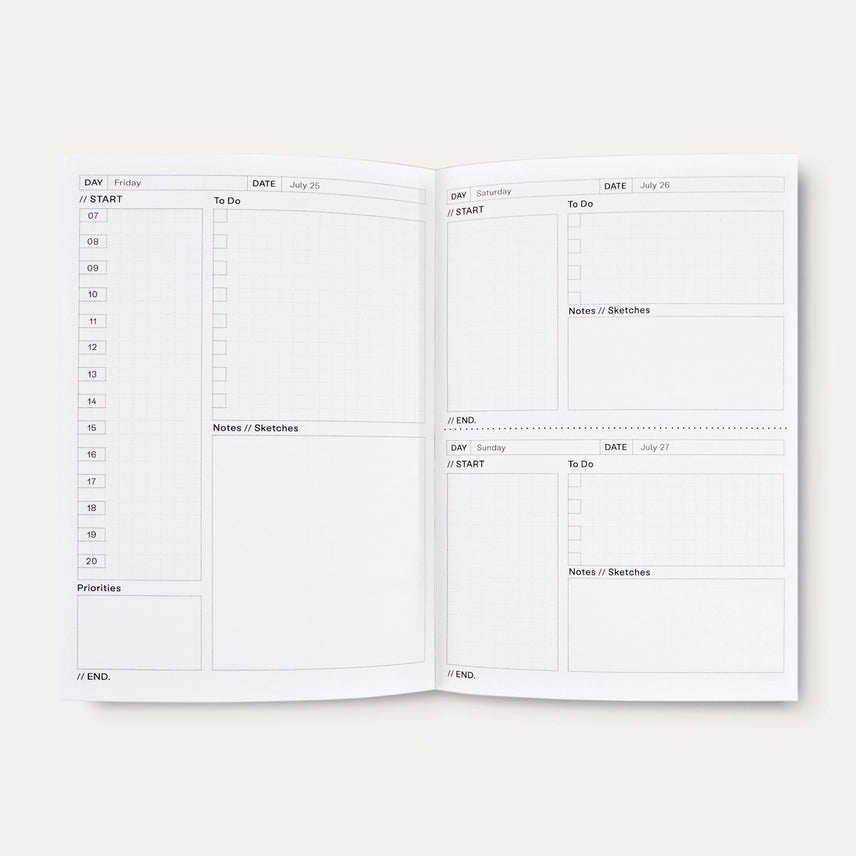 From The Completist: This is a 320 page layflat daily planner. It has a day per page for week days, and a page for the weekend. This lovely book is made by a family run music book maker right here in the U.K., and the inside sheets are made from music sheet paper. The cover is a luxurious, textured 250gsm G.F. Smith card. Comes packed in a card folio box making it perfect for gifting.