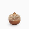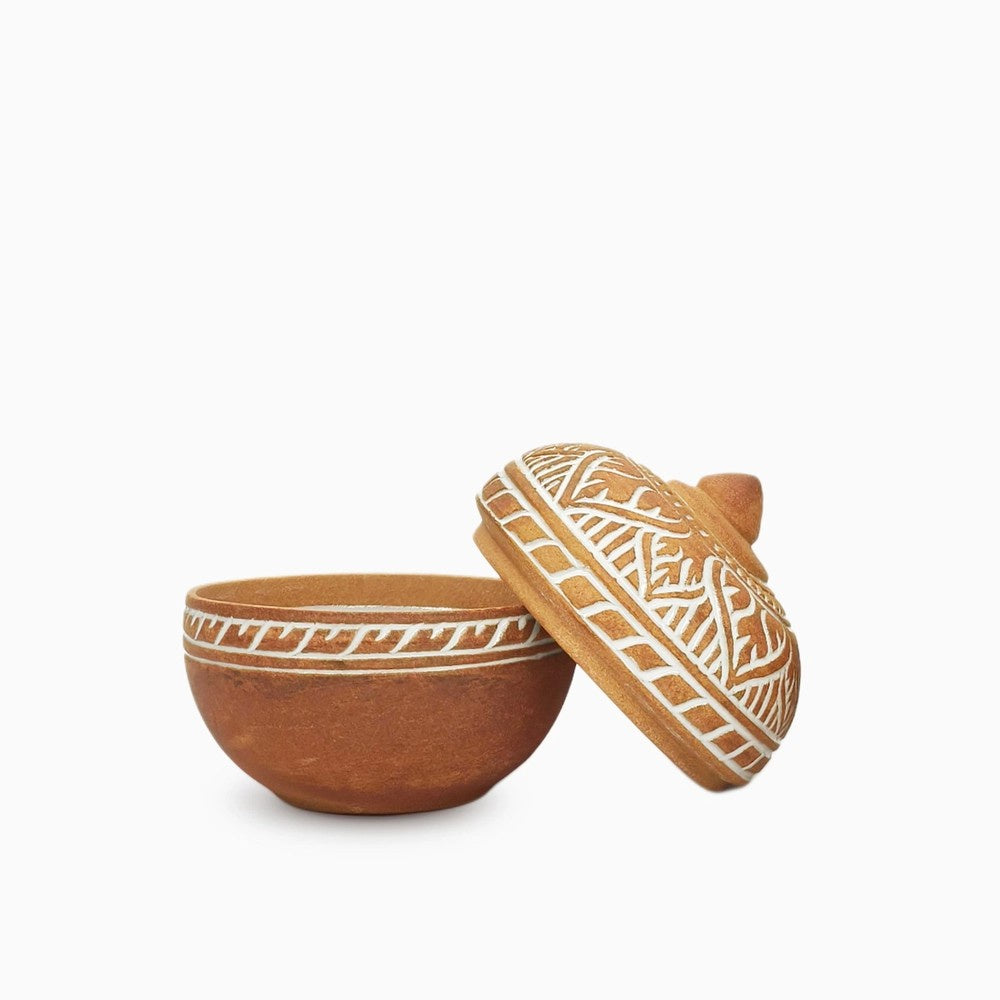 From Khmer Ceramics: This ceramic gift box is fully handmade in Cambodia. Traditional lotus motifs are hand chiseled by a master artisan, and comes housed in a palm leaf box, hand-woven from dry coconut tree leaves. A white velvet, natural glaze is applied and washed to showcase all the beauty of the natural earth. The box is fired at porcelain temperature (~1300C - ~2400F); which makes it a timeless piece of art that can resist the tide of time.