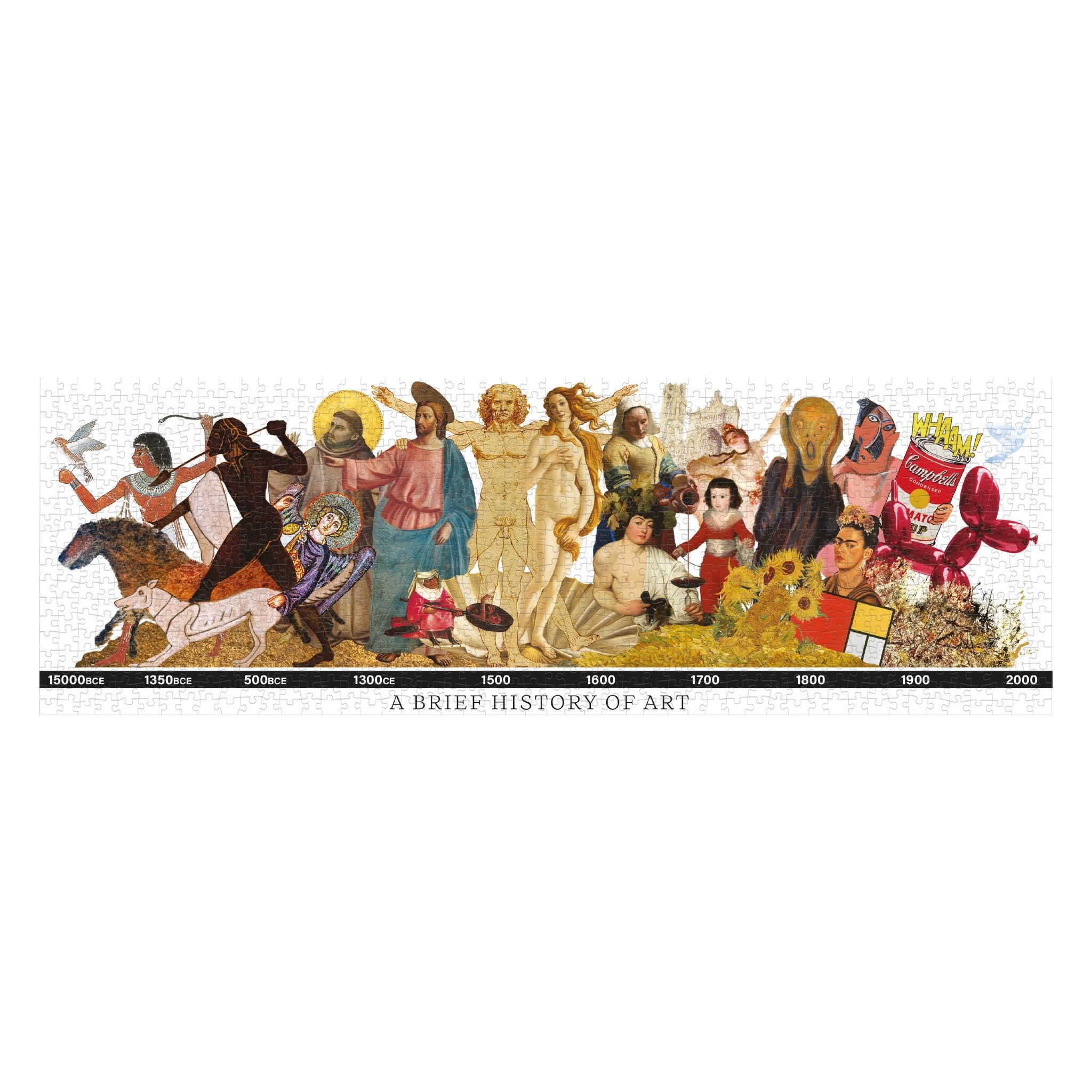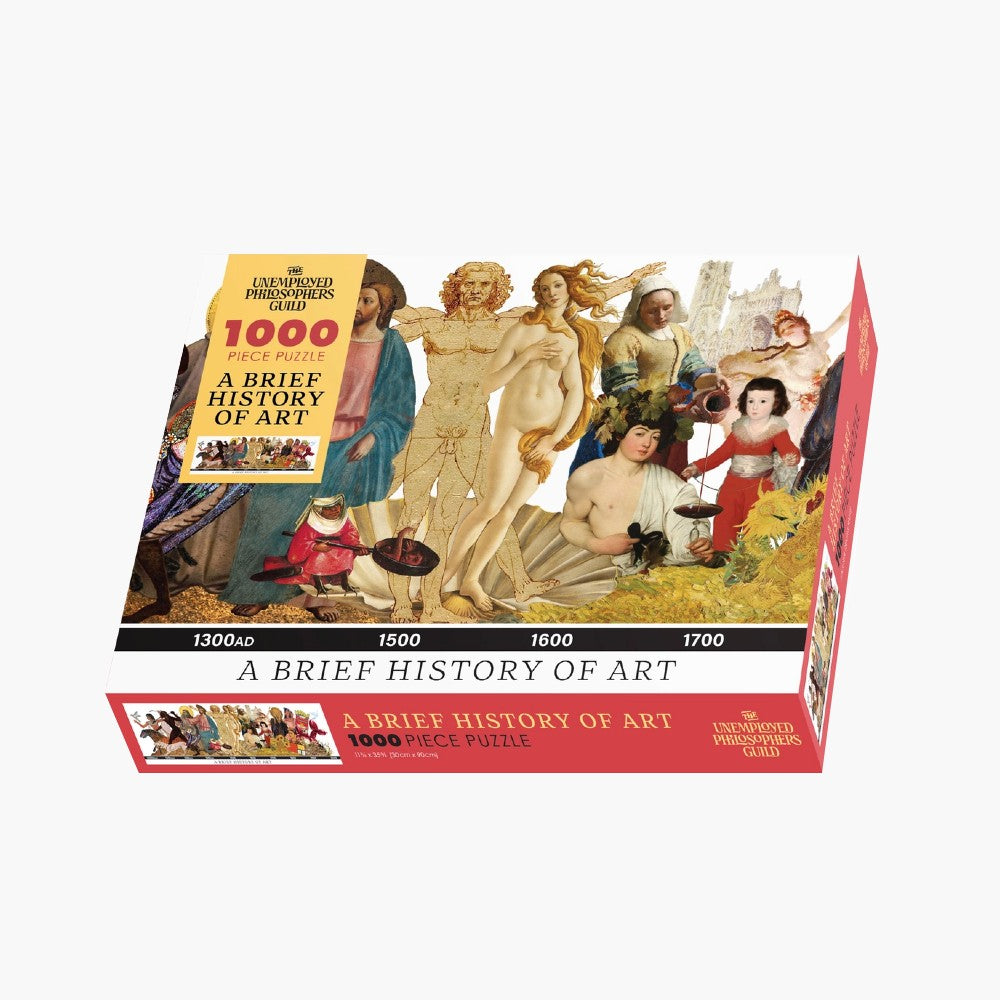 From Unemployed Philosophers Guild: Now you can relive the history of Western Art in a single weekend! Each time you assemble this puzzle, you receive an entire course in Art History in a merest fraction of the time! That’s 1/6,205,000 of the time it took to make the art, starting 15,000 BCE and ending in the late 20 century. Or it’s only 1/10 of the time it would take for an Art History 101 class. (But only if you don’t do the reading.)Our colorful, cultural jigsaw puzzles are 1,000-piece wonders that deserve to be center stage.